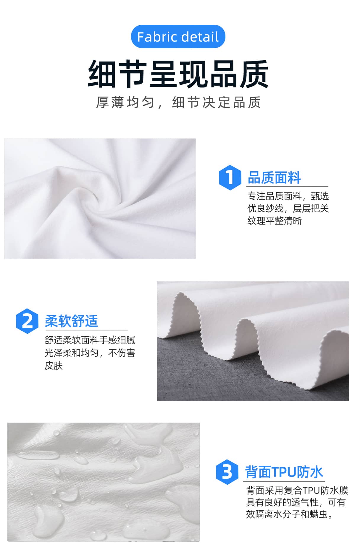 防水透气、抗菌防霉、手感柔软。产品用途是床笠、床垫、枕套等。成分为法兰绒和TPU,幅宽和颜色支持定制。